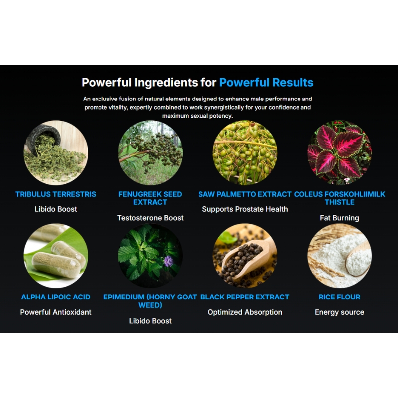 The powerhouse ingredients of FORZIX include Tribulus Terrestris, Fenugreek Seed Extract, Saw Palmetto Extract, Coleus Forskohlii, Milk Thistle, Alpha Lipoic Acid, Epimedium (Horny Goat Weed), Black Pepper Extract, and Rice Flour. Each of these ingredients plays a unique role in promoting overall male health.